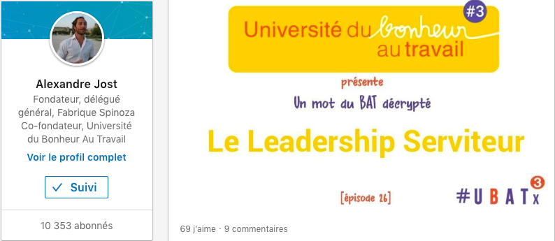 Alexandre Jost, fondateur de la Fabrique Spinoza et cofondateur de l’UBAT, livre une interview pour Entreprises & Carrières. Dans celle-ci sont évoquées les questions autour du bonheur au travail à l’heure où ce terme suscite encore « une méfiance croissante ». Il met un point d’honneur à présenter bonheur comme une source de performance, favorisée par l’entreprise libérée. Retrouvez l’article