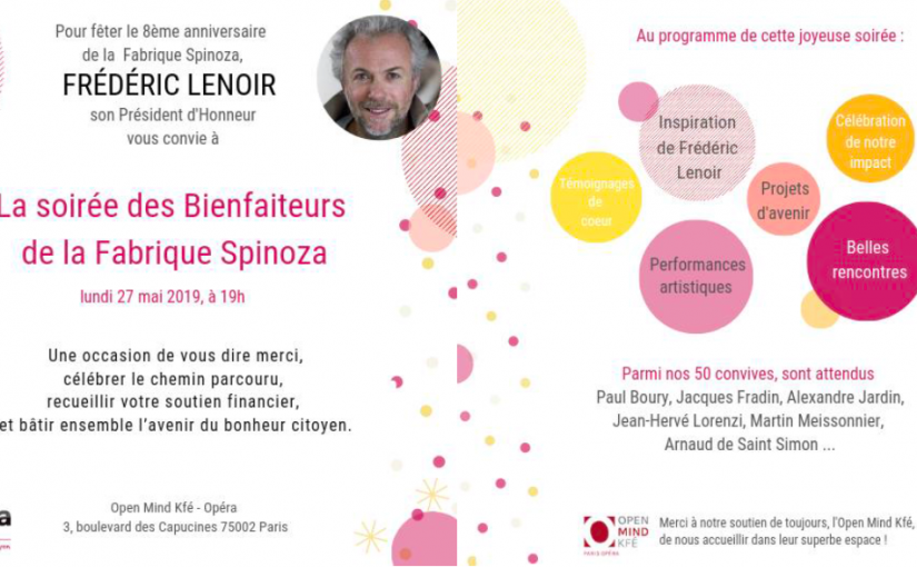 Pour célébrer le 8eme anniversaire de la Fabrique Spinoza, Frédéric Lenoir, son président d’honneur vous convie à La soirée des Bienfaiteurs de la Fabrique Spinoza le lundi 27 Mai 2019 à l’Open Mind Kfé-Opéra. L’objectif de cette soirée est triple : rassembler les acteurs du bonheur et célébrer le chemin parcouru ; faire appel aux […]